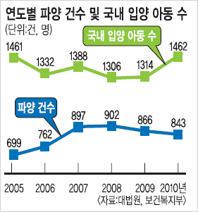 현재 국내 입양은 2005년 1461건, 2007년 1388건, 2008년 1306건, 2010년 1462건 등 해마다 1300∼1400건을 기록하고 있다. 하지만 2006년 이후 파양 건수가 입양 건수의 절반을 훨씬 넘고 있다.