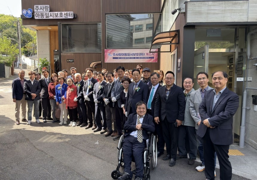 참석자들이 23일 서울 관악구 주사랑아동일시보호센터 앞에서 센터 개소를 기념해 테이프를 자르고 있다. 센터 제공 주사랑아동일시보호센터(센터장 전형진)가 23일 서울 관악구 난곡로에서 개소식을 했다.